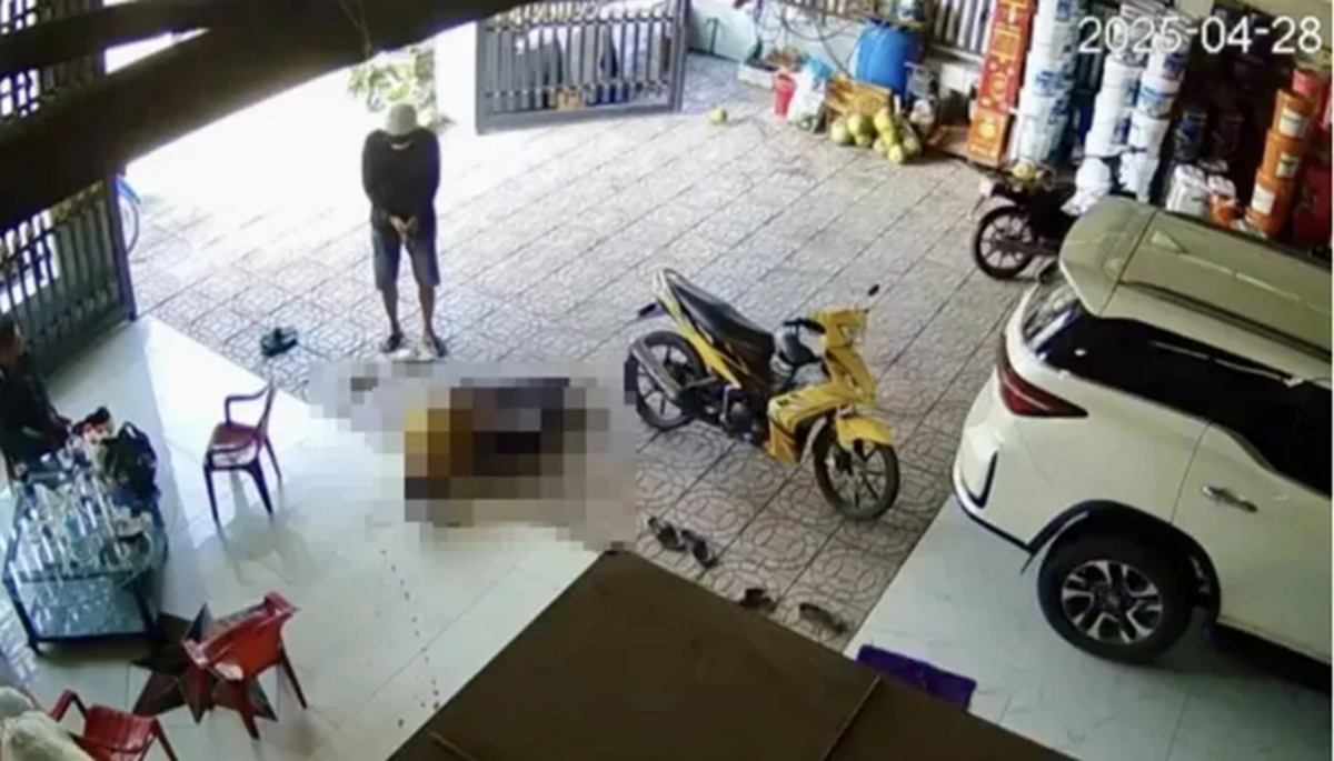 Hiện trường vụ người cha bắn tài xế xe tải cán chết con mình ở Vĩnh Long. (Ảnh cắt từ clip)