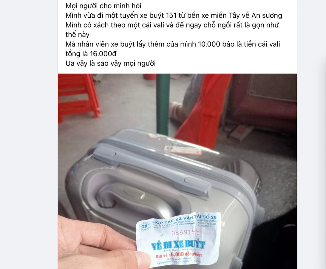 Trước đó, trên trang Facebook nhóm xe buýt TP.HCM, một hành khách tên Trường phản ánh nhân viên phục vụ trên xe buýt tuyến 151 đã thu 10.000 đồng tiền vali của mình.