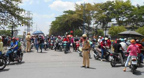 | Lực lượng CSGT quận Bình Tân điều tiết lưu thông trên đường số 7 (P.Tân Tạo, Q.Bình Tân) trưa 27/3. Ảnh: Phan Cường |