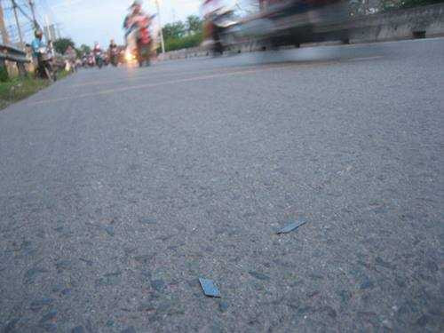 Tại giao lộ quốc lộ 1 đường số 14, chỉ trong khoảng 10 mét nhưng hàng chục mảnh kim loại hình thoi, tứ giác có các góc nhọn, sắc được rải khắp trên làn xe 2 bánh.