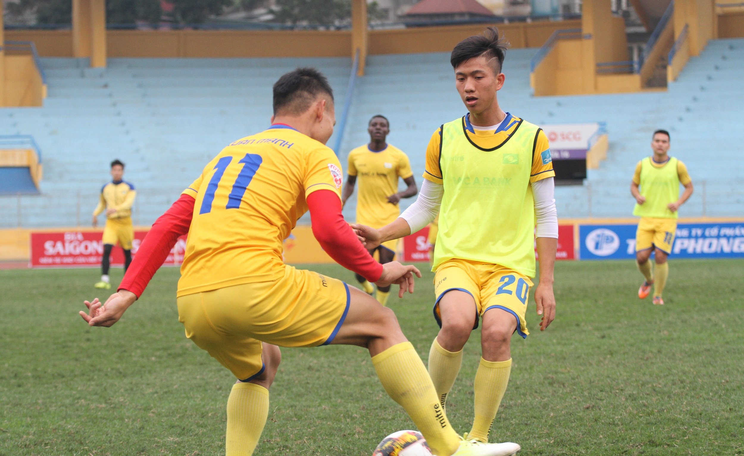 Văn Đức và Xuân Mạnh trong buổi tpaj của SLNA. (Ảnh: Ngọc Anh)