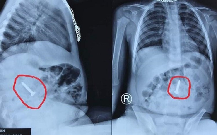 Đinh vít sắt dài 3,5 cm trong bụng em bé 20 tháng tuổi