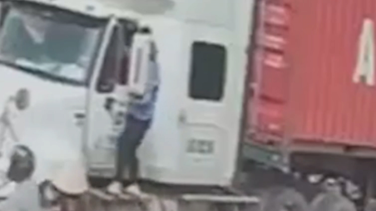 Tài xế container bị nữ nhân viên gác chắn tàu 3 lần leo cabin đánh và yêu cầu người này nhanh lùi xe lại khi đoàn tàu đang lao tới.