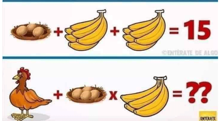 Anh Nguyễn Nam cho rằng đáp án bài toán bằng 38. Bởi tổng 3 con gà = 60 tức là 1 con gà = 20; tổng 2 con gà với 1 giỏ trứng = 26 tức là 1 giỏi trứng =3; tổng 1 giỏ trứng + 2 nải chuối = 15 tức là 2 chuối = 6. Từ đó có thể thấy trong câu cuối cùng có 1 con gà + 1 giỏ trứng x 1 nải chuối sẽ là: 20+3x6 = 38.