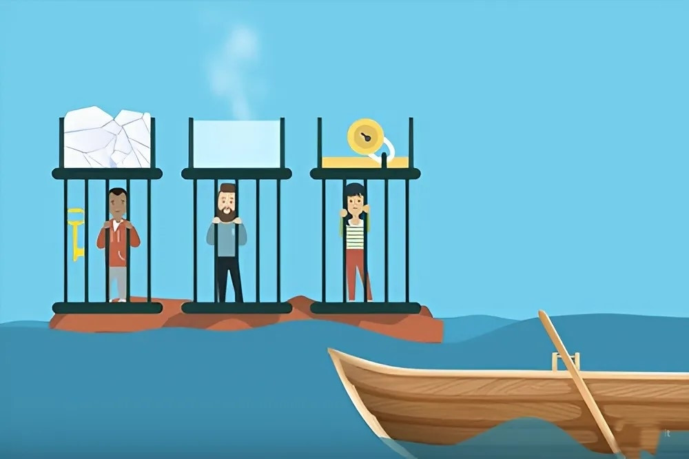 Câu đố về khả năng sinh tồn có nội dung như sau: Ba người bạn bị khóa trong 3 chiếc lồng giữa hồ nước.