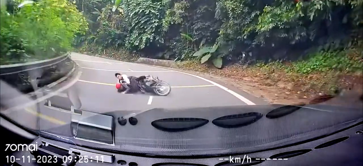 Hai thanh niên chạy xe máy không làm chủ được tốc độ, bất ngờ trượt ngã ngay trước đầu ô tô tại huyện Ba Vì, Hà Nội.