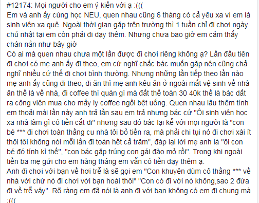 “Lần đầu tiên đi chơi có mẹ anh ấy đi theo, em cữ nghĩ chắc bác muốn gặp nên cũng chả nghĩ nhiều, cứ thế đi chơi bình thường. Nhưng những lần tiếp theo lần nào mẹ anh ấy cũng đi theo. Đi ăn thì mẹ anh kêu ăn ở ngoài, mất vệ sinh, về nhà ăn thế là về nhà. Đi coffee thì quán gì đắt thế, toàn 30 – 40k, thế là bác dắt ra công viên mua cho mấy ly coffee ngồi bệt uống”.