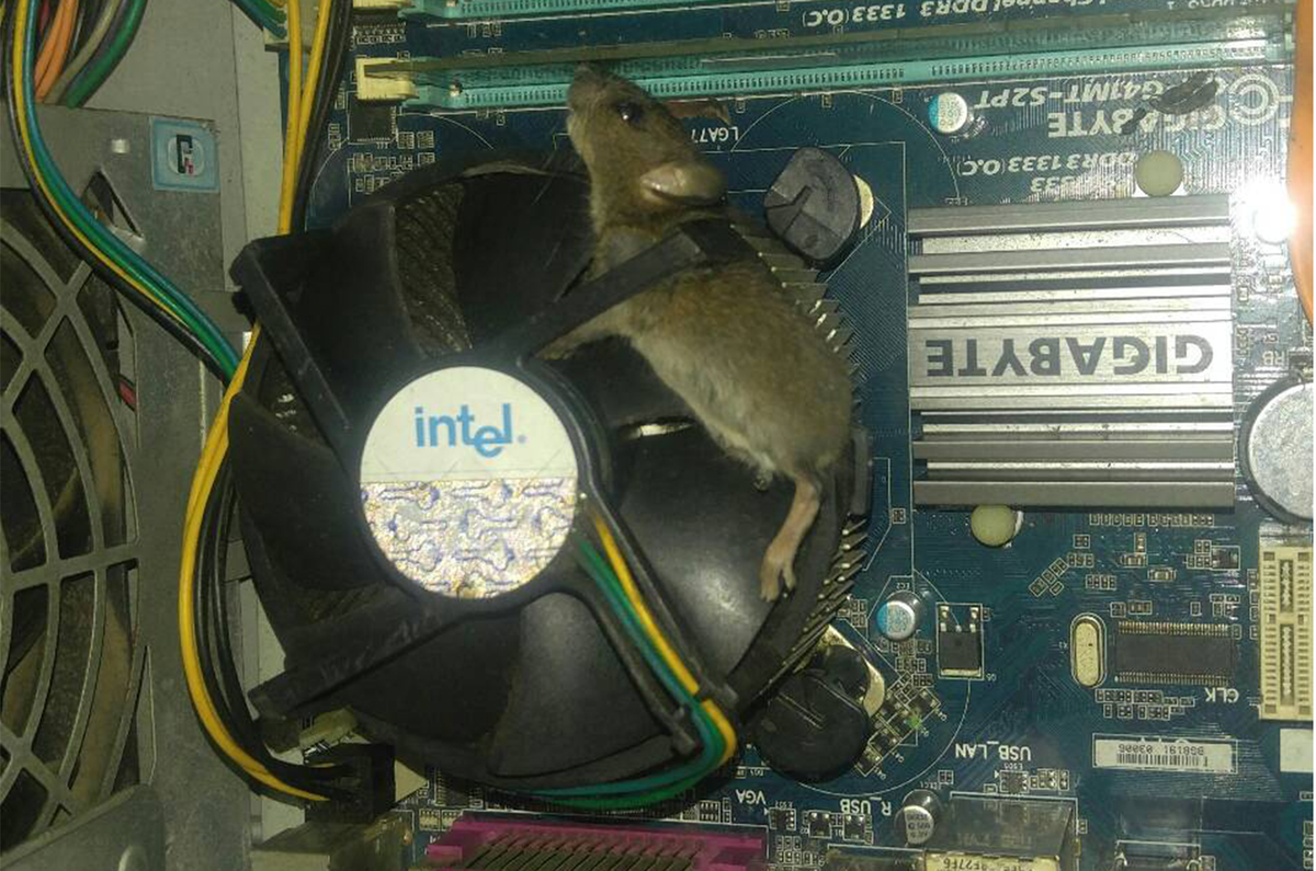 Vì chiếc máy tính không hoạt động, chàng trai này đã mở ra kiểm tra. Lọt thỏm bên trong chiếc máy tính, ngoài những linh kiện thường thấy ra, người ta bất ngờ phát hiện thêm "vị khách không mời". Một chú chuột không biết bằng cách nào đã xoay sở chui vào trong chiếc máy tính và bị mắc kẹt ở chiếc quạt tản nhiệt.