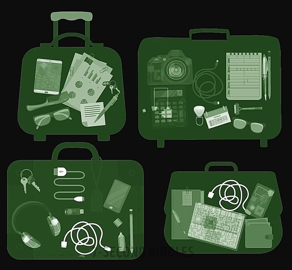 Adam tự mình kiểm tra hành lý của tất cả hành khách qua máy quét an ninh. Sau một hồi tra xét, anh đã tìm thấy điểm khả nghi. Bạn hãy nhìn hình vẽ và cho biết chất nổ nguy hiểm kia được giấu ở đâu nhé.
