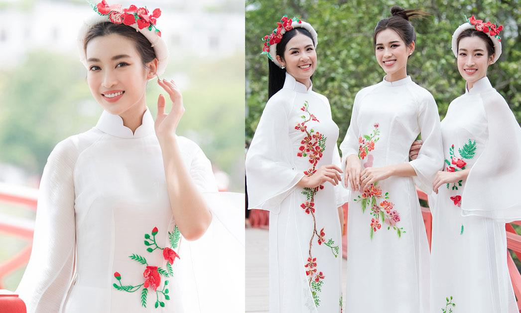 Cả 3 nàng hậu diện áo dài trắng với hoạ tiết hoa phượng đỏ - những thiết kế của Ngọc Hân - để ghi hình, chụp ảnh tại đền Ngọc Sơn, cầu Thê Húc, Nhà hát Lớn hay trải nghiệm đi xích lô, xe buýt 2 tầng. Dù làm việc dưới thời tiết nắng nóng của mùa hè nhưng tất cả đều không hề tỏ ra mệt mỏi, luôn rạng rỡ.