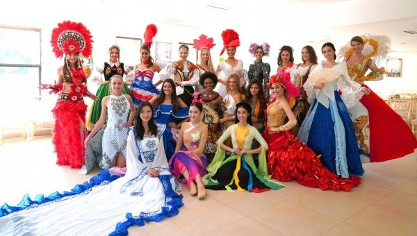 Đỗ Mỹ Linh rạng rỡ cùng bạn bè quốc tế trong phần thi phụ Traditional Dance.