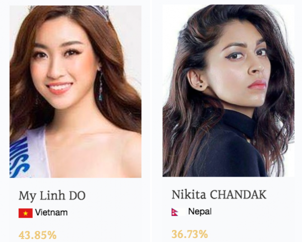 2 tiếng trước khi tìm ra Thí sinh được bình chọn nhiều nhất, đại diện Việt Nam vẫn xuất sắc đứng đầu cuộc đua với 43,85% vote. Người đẹp Nepal - đối thủ của Mỹ Linh tại vòng online tiếp tục theo sát từng phiếu vote với 36,73% lượt bình chọn.