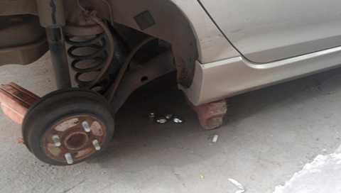 Hiện trường còn chỏng chơ 4 cái bu lông ở mỗi bánh. Nếu mua mới hoàn toàn, trị giá của 4 chiếc bánh này ước tính vào khoảng từ 10 đến 15 triệu đồng cho cả la-zăng (mâm) và lốp tùy theo từng chủng loại.