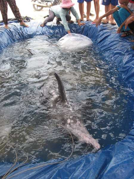 | Cá ông được người dân làm bể chăm sóc đặc biệt ngay tại bờ biển. |