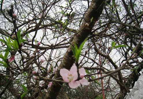 | Gốc đào ở chỗ lớn nhất rộng khoảng 50cm, với nhiều khúc uốn lượn, vỏ sù sì phủ đầy rêu phong. |