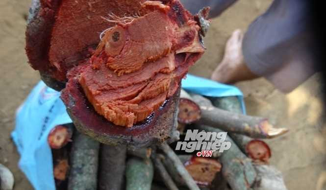 Giây lát sau, một người trong số họ bất ngờ vung con dao đi rừng bén ngót phạt ngang thân dây. Tức thì, một dòng nhựa đỏ như máu ứa ra. Cả nhóm cùng reo lên mừng rỡ: “Đúng nó rồi” và lập tức chặt hết cụm dây leo xuống, cắt thành từng đoạn dài 50 cm, dùng một miếng ni lông mỏng bịt chặt các đầu thân dây đang “ứa máu” lại.