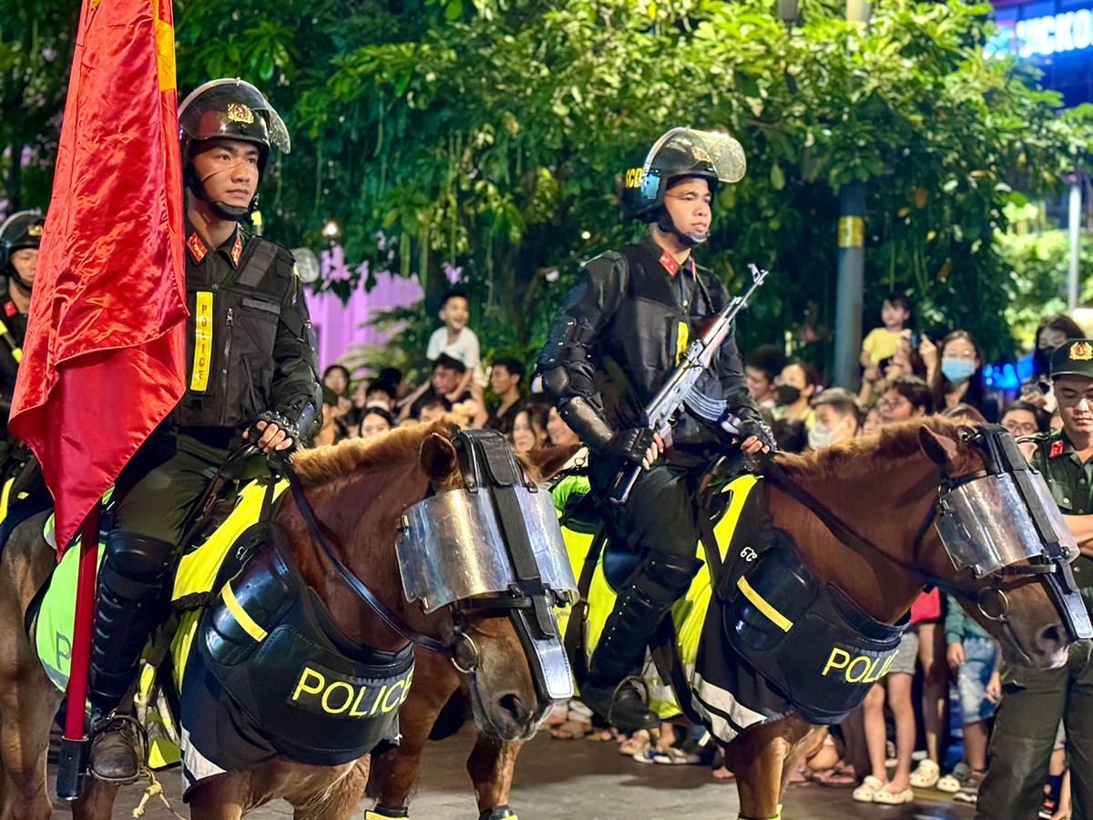 Khoảng 20h15 phút, đoàn Cảnh sát cơ động kỵ binh bắt đầu diễu hành. Lãnh đạo Công an TP.HCM chào đoàn khi đi qua khu vực trung tâm.