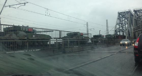 Bức ảnh cho thấy đoàn xe tăng có sơn hình cờ Trung Quốc cùng xe tải và xe jeep quân sự xuất hiện trên cây cầu từ trong thành phố Krasnoyarsk ra ngoại ô.