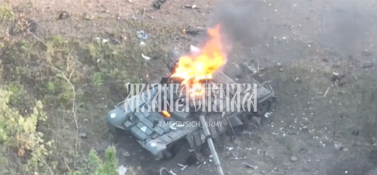 Hình ảnh đầu tiên trong đoạn video là chiếc xe tăng T-72 của Ukraine bị trúng đạn, khiến kho đạn dược bốc cháy dữ dội. Đai xích của xe tăng bị bung ra và các bánh xe bị văng xung quanh do sóng xung kích từ vụ nổ. Một số chuyên gia cho rằng, chiếc xe tăng ban đầu đã va phải mìn, sau đó bị bắn hạ bằng đạn pháo hoặc tên lửa chống tăng có điều khiển.