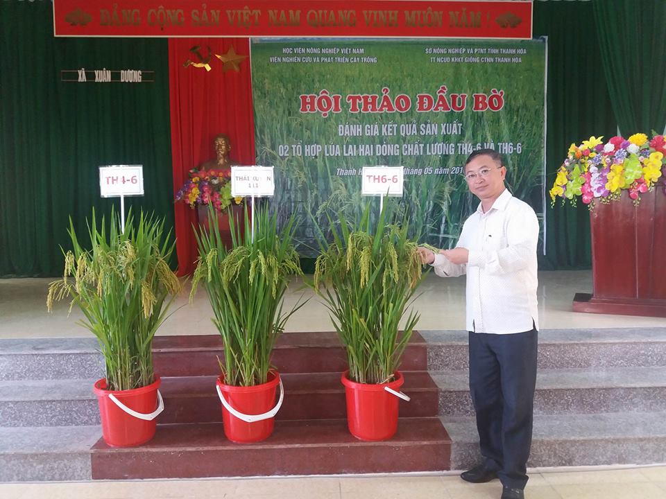 Ông Lâm Văn Chiểu, Phó giám đốc công ty Cường Tân giới thiệu những giống lúa mà công ty nắm bản quyền trong một Hội thảo đầu bờ đánh giá kết quả sản xuất tổ hợp lúa lai hai dòng.