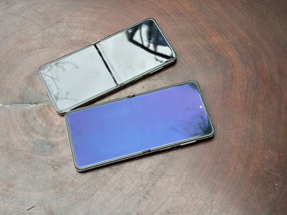 Chiếc Galaxy Z Flip5 (trên) lộ rõ vết gập màn hình khi đặt cạnh Oppo Find N3 Flip dù Samsung đi trước nhiều năm về công nghệ cũng như nghiên cứu, phát triển màn hình dẻo có thể gập lại