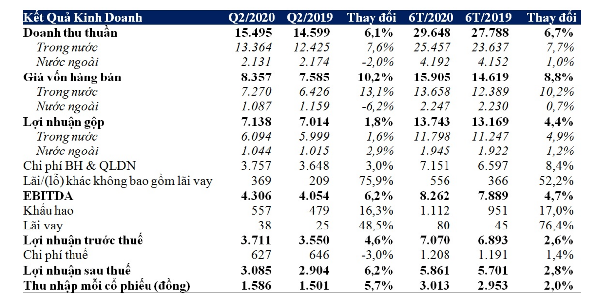 Lợi nhuận sau thuế hợp nhất Q2/2020 đạt 3.085 tỷ đồng, tăng 6,2% so với cùng kỳ 2019. Biên lợi nhuận ròng hợp nhất đạt 19,9%, bằng với cùng kỳ 2019 và thu nhập mỗi cổ phiếu đạt 1.586 đồng, tăng 5,7% so với cùng kỳ 2019.
