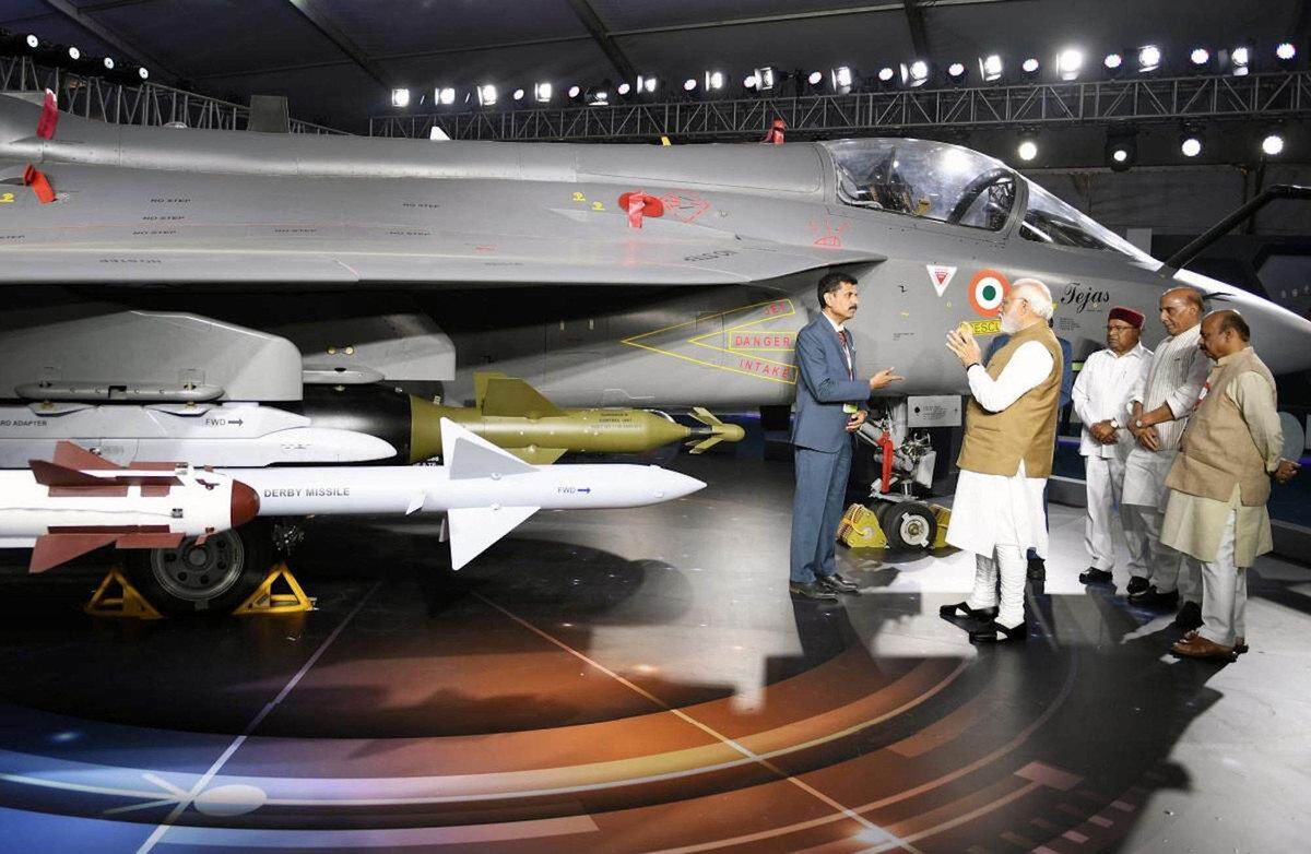 Thủ tướng Ấn Độ Narendra Modi thăm gian trưng bày máy bay tiêm kích nội địa hạng nhẹ HAL Tejas tại triển lãm Aero India 2023 ở Bangalore hồi tháng 2. (Ảnh: ANI)