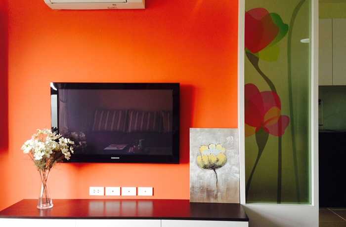 Một căn hộ diện tích nhỏ (80 m2) với 2 phòng ngủ, 1 phòng khách luôn khiến chủ nhân phải đau đầu nghĩ cách làm tăng diện tích lên. Chính vì thế phòng khách khéo léo đưa bức tranh kính vào làm không gian rộng ra và che khuất đi được một góc ở khu bếp. Cửa sổ kính lớn cũng làm phòng khách không bị kín lại và tạo được view cho căn phòng. Gam màu cam cũng tạo cảm giác sang trọng, ấm áp.