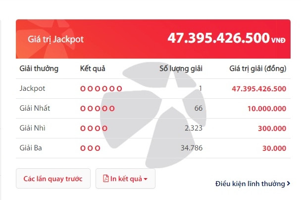 Trước đó, vào tối 6/8, chủ một thuê bao Viettel cũng trúng Jackpot 1 của sản phẩm Power 6/55 trị giá lên đến hơn 228 tỷ đồng. Tấm vé may mắn có bộ số gồm: 22 – 34 – 44 – 46 – 54 – 55. Sau khi trừ thuế thu nhập cá nhận theo quy định thì chủ nhân tấm vé sẽ thực lĩnh gần 206 tỷ đồng.
