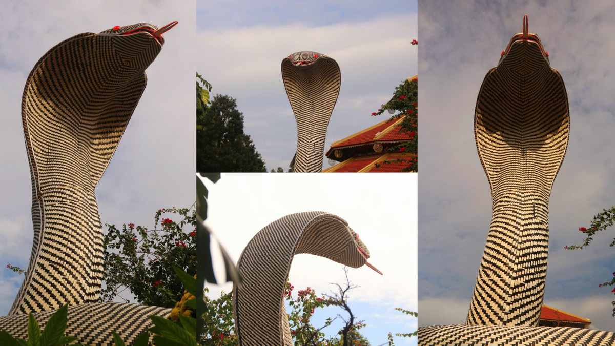 Chị Lê Nguyễn Ái Quỳnh - Quản lý làng nghề Trường Sơn cho hay, năm nay làng nghề Trường Sơn trưng bày linh vật rắn cao 4,5m tính luôn phần đế, có 3 vòng tròn và mỗi vòng rộng khoảng 3m. Bên trong được làm bằng khuôn nhôm và bên ngoài làm nguyên liệu sợi thủy tinh từ nhựa nguyên sinh.