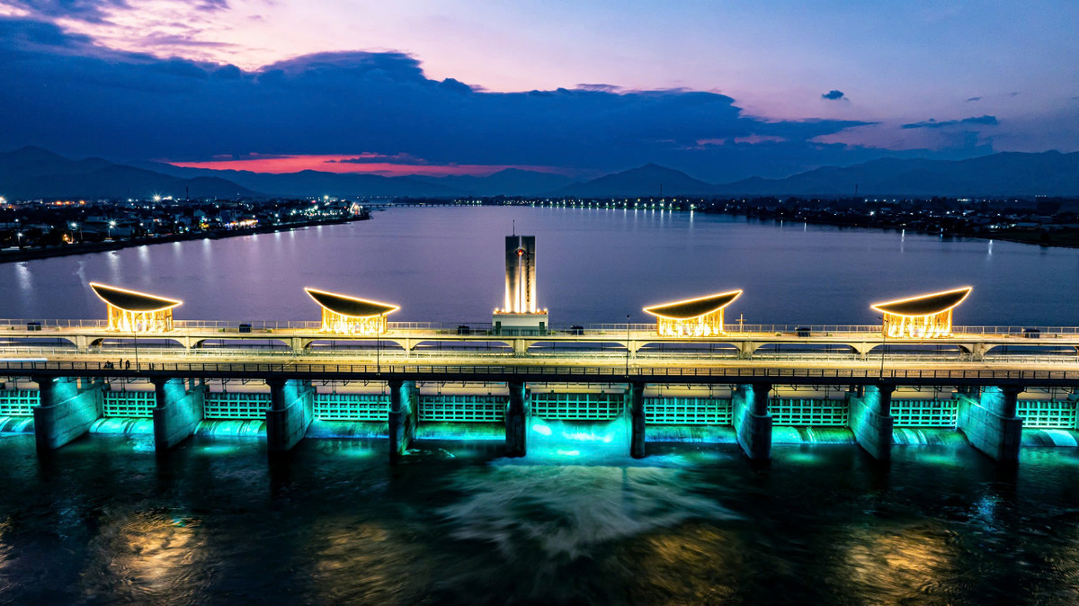 Đập dâng Phú Phong được phủ ánh sáng từ chân lên đến đỉnh theo nhiều kịch bản chiếu sáng khác nhau.