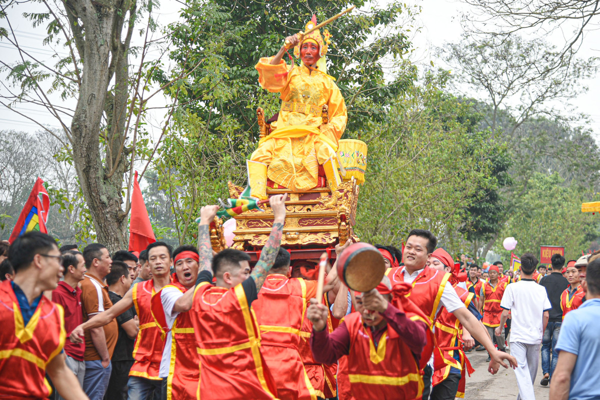 Kiệu chúa năm nay được gần 30 thanh niên là con cháu dòng họ Trần thay phiên nhau đỡ và tung hô. Cứ đi khoảng 20 - 30m, đoàn rước kiệu sẽ dừng lại để tung kiệu lên cao, xoay vòng tròn, hò reo náo nhiệt. Trong khi trai tráng tung kiệu, chúa ngồi trên vung kiếm chém để khuấy động hào khí.