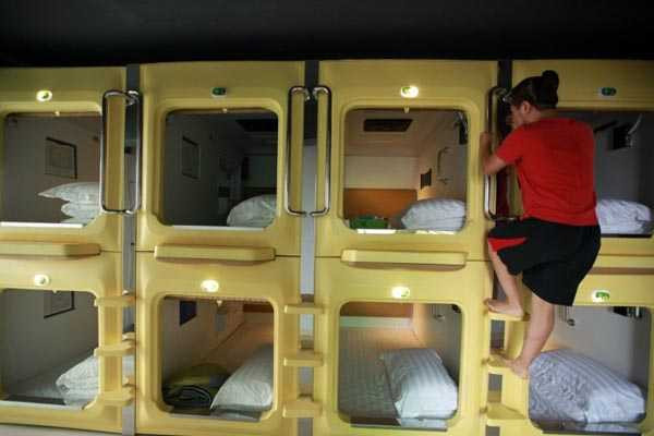 Khách trèo lên một phòng trong khách sạn 'con nhộng' ở Hải Khẩu.