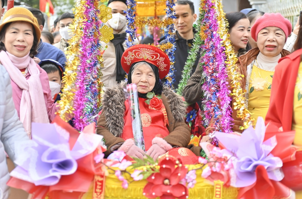 Nét độc đáo, hấp dẫn và được mọi người dân háo hức chờ đợi nhất là hoạt động rước các cụ thượng thọ tròn 80, 90 và 100 tuổi lên miếu Tiên Công