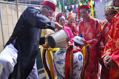 | Nước được lấy từ giếng đổ vào bình thiêng với nghi thức trang trọng |