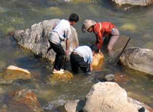 Ngược lên theo dòng suối, qua cầu Lao Chải khoảng 500m, chúng tôi bắt gặp một đoàn hơn chục người Mông, độ tuổi từ 13 - 20 cũng đang say sưa đánh bắt. Vì khu vực này nước sâu hơn, nên bộ đồ nghề của nhóm này ngoài xà beng và đó tre còn có thêm cả chài và vợt xúc. Những tấm thân phơi trần trong nắng đang thi nhau mải miết quăng chài và xúc, gặp chỗ nước nông họ lại thục xà beng mà bẩy đá chặn đó.