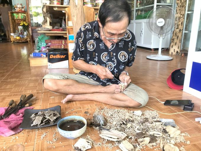 Người thợ xoi xỉa trầm ngồi bệt dưới nền nhà, mắt đăm đăm vào miếng cây dó cả ngày. Ảnh: V.Đ.T.