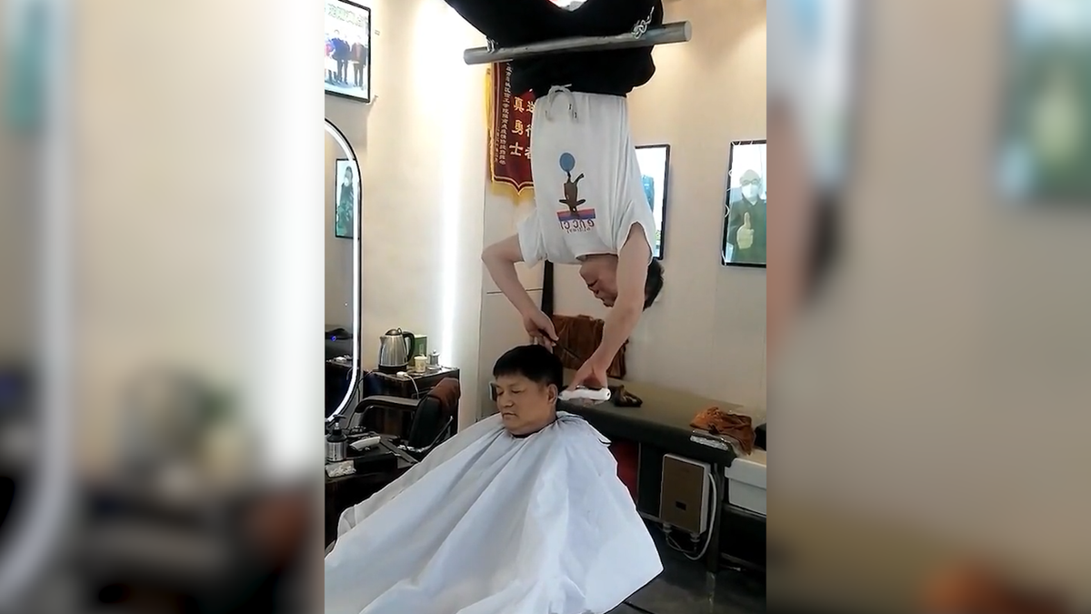 Thợ làm tóc ở Trung Quốc trình diễn kỹ thuật điêu luyện khi mình trên trần nhà để cắt tóc cho khách.
