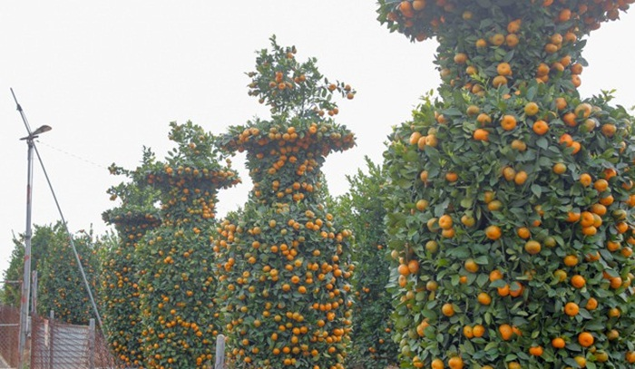 Theo đó, cây quýt đủ điều kiện tạo thế lục bình phải là cây già từ 3 - 5 năm, có tán rộng. Thời gian tạo thế mỗi cây quýt lục bình phải mất từ 4 - 5 ngày. (Ảnh: Tiền phong)