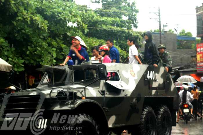 Chiếc xe lội nước của quân đội chở thí sinh đến trường thi khiến người đi đường cũng tò mò