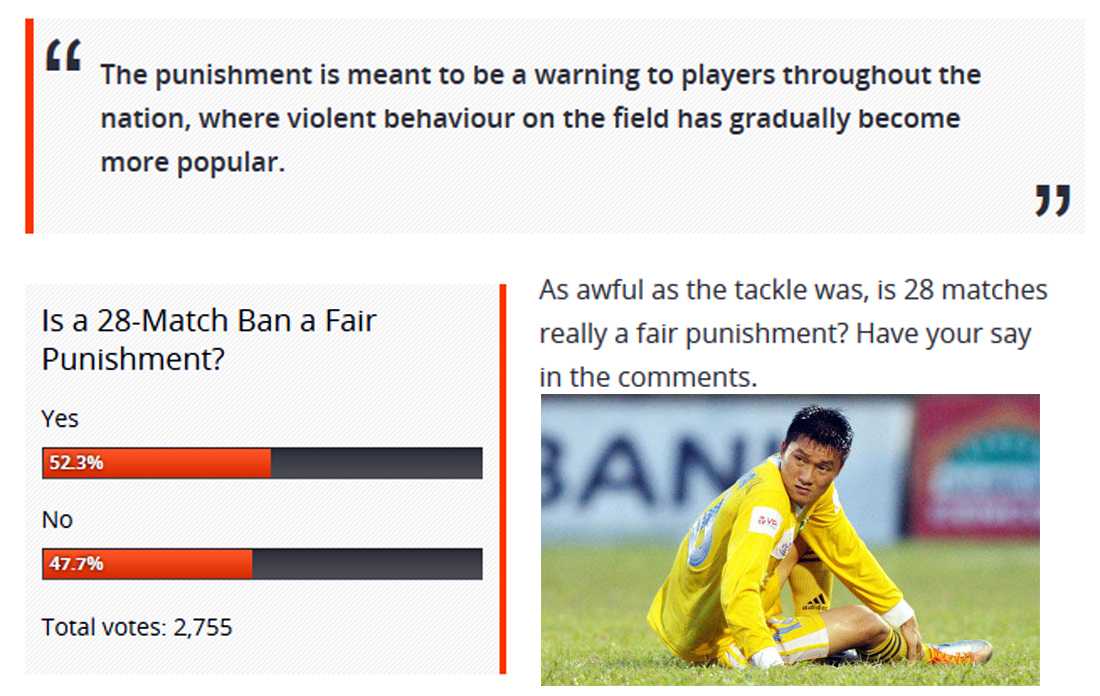 Không những chỉ đăng tải thông tin xunh quanh án phạt của Đình Đồng, trang thể thao uy tín của Anh là Bleacherreport còn thăm dò những người theo dõi clip Đình Đồng va chạm với Anh Hùng, xem án phạt cấm thi đấu 28 trận mà hậu vệ xứ Nghệ phải nhận từ VFF có xứng đáng không?
