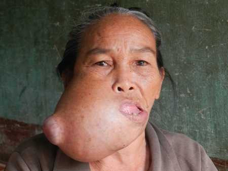 Như VTC News đã thông tin, suốt 6 năm nay, cụ Cân phải sống chung với khối u quái ác trên mặt. Lúc đầu, khối u chỉ bằng hạt đậu, sau đó lớn dần thành hạt mít, hạt xoài rồi phát triển to lên làm khuôn mặt bà bị biến dạng. Phần lợi và răng hàm bị đẩy lật xuống dưới khiến bà không tài nào nhai nổi một thứ gì.