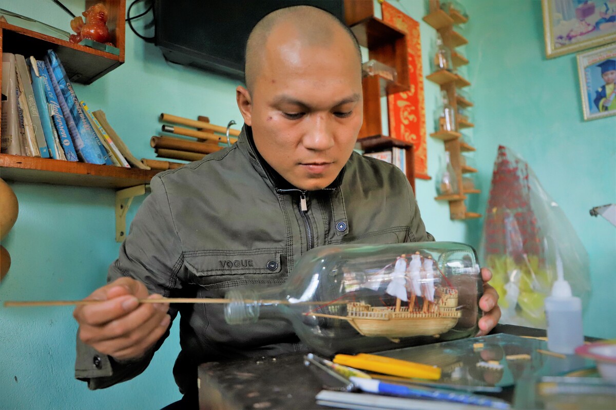 Chủ nhân của bộ sưu tập ấy là anh Đặng Hồng Ron, người đã hơn 10 năm lặng lẽ theo đuổi một loại hình nghệ thuật thủ công độc đáo, hiếm gặp tại Việt Nam là tạo tác mô hình tăm tre thu nhỏ trong chai thủy tinh.