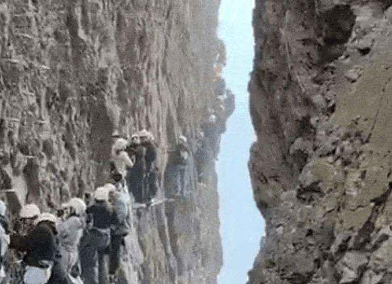 Video đăng tải trên mạng cho thấy một lượng lớn người leo núi chôn chân trên sườn núi thẳng đứng không thể di chuyển. Xung quanh là vách đá dựng đứng và dưới chân là vực thẳm, vô cùng nguy hiểm.