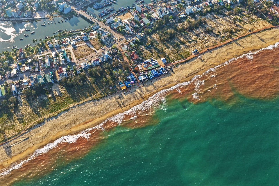 Từ trên cao, hình ảnh bờ biển với làn nước chia làm hai màu nâu đỏ và xanh dương đối lập, khiến khung cảnh vùng biển Thiện Chánh trở nên khác biệt, độc lạ và bắt mắt.