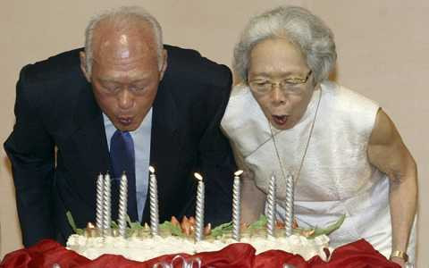 | Ông Lý Quang Diệu và bà Kha Ngọc Chi cùng thổi nến trong ngày sinh nhật 80 tuổi của ông năm 2003. |