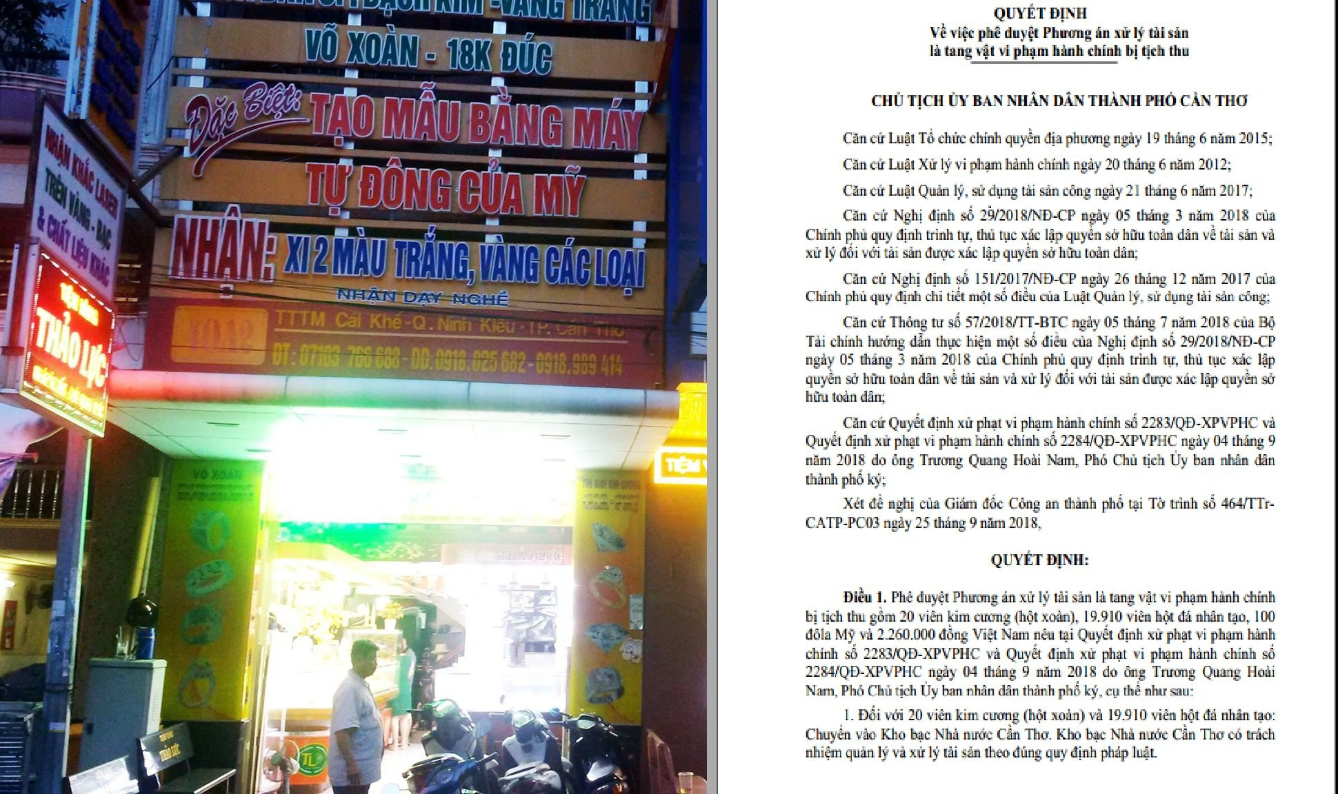 Cũng theo quyết định này, tổng cộng 20 viên kim cương và 19.910 viên hột đá nhân tạo (trị giá hơn 548 triệu đồng) mà cơ quan công an tịch thu tại tiệm vàng Thảo Lực sẽ chuyển vào Kho bạc Nhà nước Cần Thơ. Kho bạc Nhà nước Cần Thơ có trách nhiệm quản lý và xử lý tài sản theo đúng quy định pháp luật.