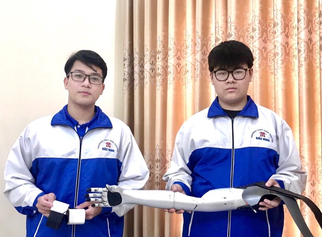 “Cánh tay robot cho người khuyết tật liệt cơ tay toàn phần” của 2 em Phạm Đức Linh và Nguyễn Đức An, học sinh trường THPT Hàn Thuyên, tỉnh Bắc Ninh đoạt giải Ba quốc tế lĩnh vực Kỹ thuật cơ khí, cùng giải thưởng 1000 USD (khoảng 23 triệu đồng).