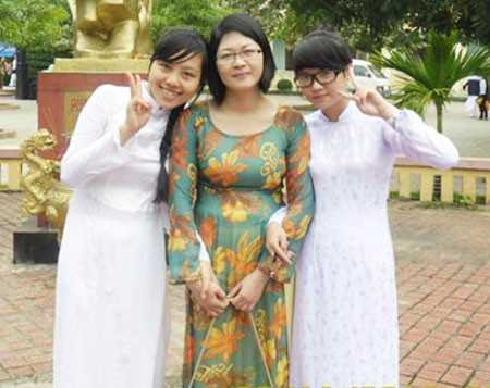 | Hà và Trang chụp ảnh cùng cô giáo chủ nhiệm. |