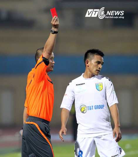 | Sỹ Cường nhận thẻ đỏ (Ảnh: Quang Minh) |